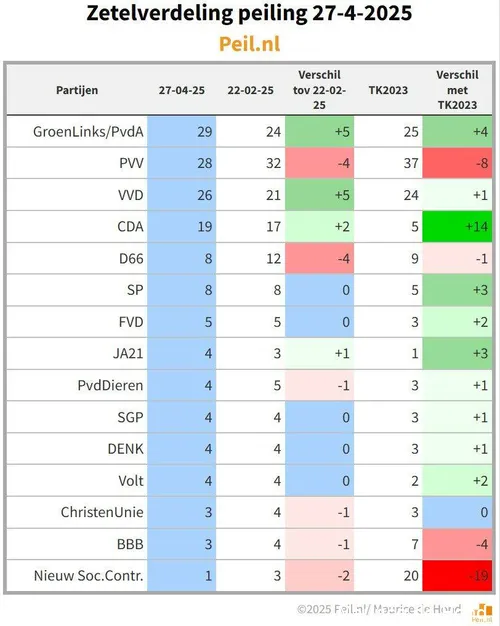 GroenLinks/PvdA en de VVD zitten stevig in de lift. Andere partijen, vooral