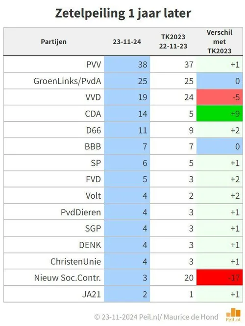 Eén jaar na de verkiezingen domineert de PVV nog steeds, terwijl het CDA
