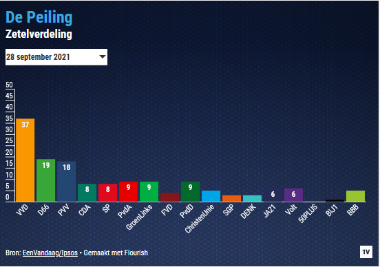De kiezer, die volgens VVD-leider Mark Rutte "gekozen heeft", lijkt langzamerhand terug te komen op zijn keuze. De drie grootste partijen (VVD, D66, CDA) die nu bezig zijn met de formatie verliezen allemaal twee zetels ten opzichte van vorige peilingen van EenVandaag. Ondanks dit verlies staat de VVD nog steeds ruim op winst in de peilingen, vergeleken met de verkiezingsuitslag en de zetelaantallen van D66 en het CDA. Toen kregen ze 34 zetels, in augustus stonden ze op 39 zetels en deze maand is dat weer gezakt naar 37 zetels. Al met al staat die partij dus nog op +3 zetels winst.