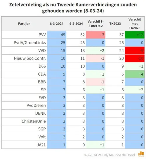 eerdere winst van 15 zetels sinds november. De VVD daalt het verlies van 11