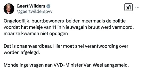 In zijn tweet schrijft hij: "Ongelooflijk, buurtbewoners belden meermaals de politie voordat het meisje van 11 in Nieuwegein bruut werd vermoord, maar ze kwamen niet opdagen. Dat is onaanvaardbaar. Hier moet snel verantwoording over worden afgelegd. Mondelinge vragen aan