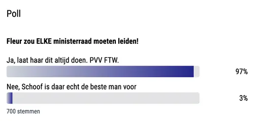 Het was een historisch moment: gisteren leidde Fleur Agema, vice-premier namens de PVV, voor het eerst de ministerraad. Een mijlpaal voor de partij die de verkiezingen van 2023 op grootse wijze won. Maar volgens onze lezers is dit slechts het begin. In een interne peiling gaven zij aan dat Agema altijd de ministerraad moet leiden – en niet Dick Schoof, de zogenaamde ‘AIVD-premier’ die door het partijkartel naar voren is geschoven. We hebben het over maar liefst 97% (!) van onze lezers die dit vinden. En laten we eerlijk zijn: dat is niet zo gek. De PVV heeft de verkiezingen gewonnen. De PVV is de grootste partij in de Tweede Kamer. Toch is het kabinet niet in handen van de PVV, maar van een stel technocraten en partijkartel-poppetjes die vooral bezig zijn met het behagen van de linkse elite. Dat is niet alleen ondemocratisch, het is ronduit bezopen.