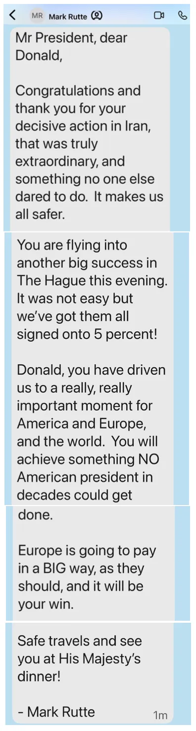 De tekst van Rutte – bewust of niet – laat zien waarom Europese leiders keer op keer hun geloofwaardigheid verliezen. Ze proberen mee te buigen met iedere wind, slijmen bij de machtigen, en vergeten hun eigen waarden en burgers.