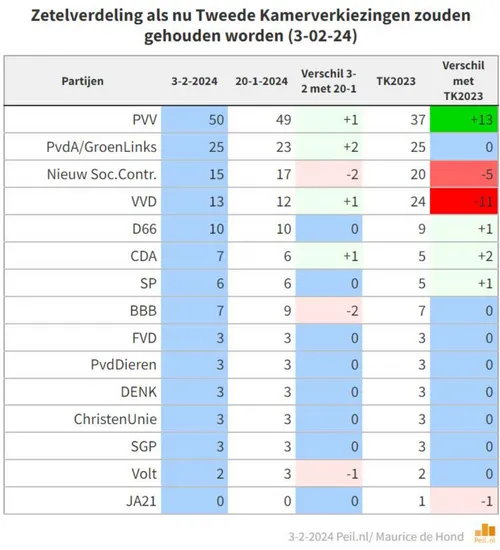 Het is ongelooflijk, maar de PVV blijft maar doorstijgen in de peilingen. Als er vandaag verkiezingen waren zouden Geert Wilders en de zijnen namelijk uitkomen op 50 zetels (!). Dat zijn er 13 meer dan op 22 november vorig jaar. En dat is niet alles dat er verandert. Want de winst van de PVV komt deels door... verlies van NSC. Heel goed. We weten onderhand allemaal dat NSC een ronduit verraderlijke partij is. Het is werkelijk het CDA 2.0.