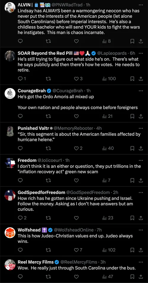 Heel gek, maar mensen vinden het blijkbaar niet zo fijn dat zo'n figuur als Graham overschakelt van Hurricane Helene naar... Israël. En dan vervolgens wil dat er heel veel geld naar Israël wordt gestuurd, en niet naar South Carolina. De staat die hij zogenaamd vertegenwoordigt in de Senaat. Bizar!