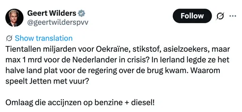 Het gepruts met marginale onbelaste reiskostenvergoedingen en vage, bureaucratische 'noodfondsen' moet per direct stoppen. De eis van Wilders is de enige werkbare en eerlijke oplossing voor dit gigantische probleem dat het kabinet zelf heeft gecreëerd.