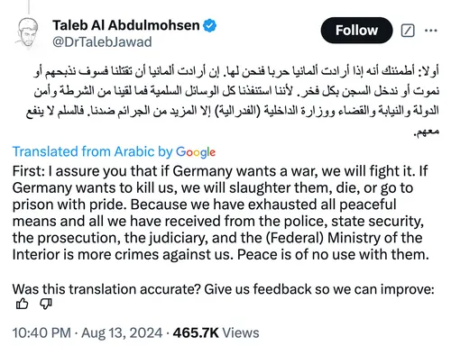 schreef hij op 13 augustus 2024 (vier maanden geleden!): "Ik verzeker je dat als Duitsland oorlog wil, wij die zullen voeren. Als Duitsland ons wil doden, zullen we hen afslachten, sterven, of met trots naar de gevangenis gaan. Omdat we alle vreedzame middelen hebben uitgeput en alles wat we van de politie, staatsveiligheid, het Openbaar Ministerie, de rechterlijke macht en het (Federale) Ministerie van Binnenlandse Zaken hebben gekregen, meer misdaden tegen ons zijn. Vrede heeft geen nut met hen."